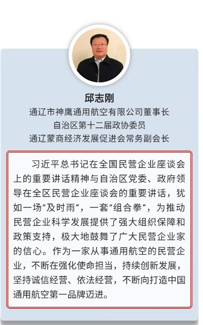 通遼市神鷹通用航空有限公司董事長(zhǎng)、自治區(qū)政協(xié)第十二屆委員會(huì)委員邱志剛,作為自治區(qū)企業(yè)家代表應(yīng)邀參加了此次座談會(huì)。會(huì)后,按照自治區(qū)統(tǒng)戰(zhàn)部的統(tǒng)一部署,提交了參加座談會(huì)的收獲與感受,表示:一定要認(rèn)真貫徹布小林主席講話精神,不斷在強(qiáng)化使命擔(dān)當(dāng),持續(xù)創(chuàng)新發(fā)展,堅(jiān)持誠(chéng)信經(jīng)營(yíng)、依法經(jīng)營(yíng)上下功夫,不斷向中國(guó)通用航空第一品牌邁進(jìn)。